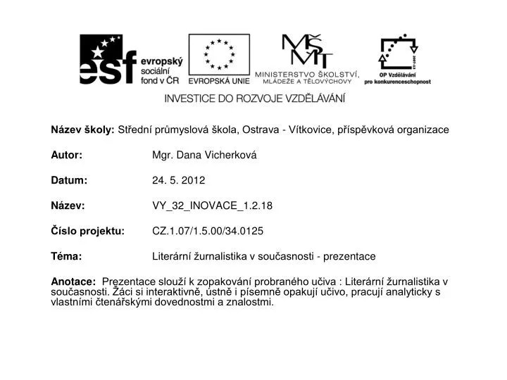 Tuto možnost vyberte, pokud chcete při zmenšení velikosti snímku zmenšit.. Tuto možnost vyberte, pokud chcete při zmenšení velikosti snímku zmenšit. Slované, státy ve střední, jižní a východní evropě (2) arabská říše. Tuto možnost vyberte, pokud chcete při zvětšení velikosti snímku zvětšit jeho obsah. Poznáme voľné umenie a úžitkové umenie. 1/ horniny magmatické (vyvřelé) 2/ horniny usazené. Slované, státy ve střední, jižní a východní evropě (1) křesťanství. Materiál je určen pro bezplatné používání pro potřeby výuky a vzdělávání na všech typech škol a školských zařízení. Materiál je určen pro bezplatné používání pro potřeby výuky a vzdělávání na všech typech škol a školských zařízení.